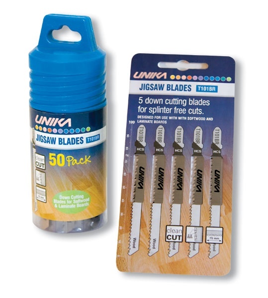 Down cutting jigsaw blades for splinter free cuts in laminate worktops and flooring